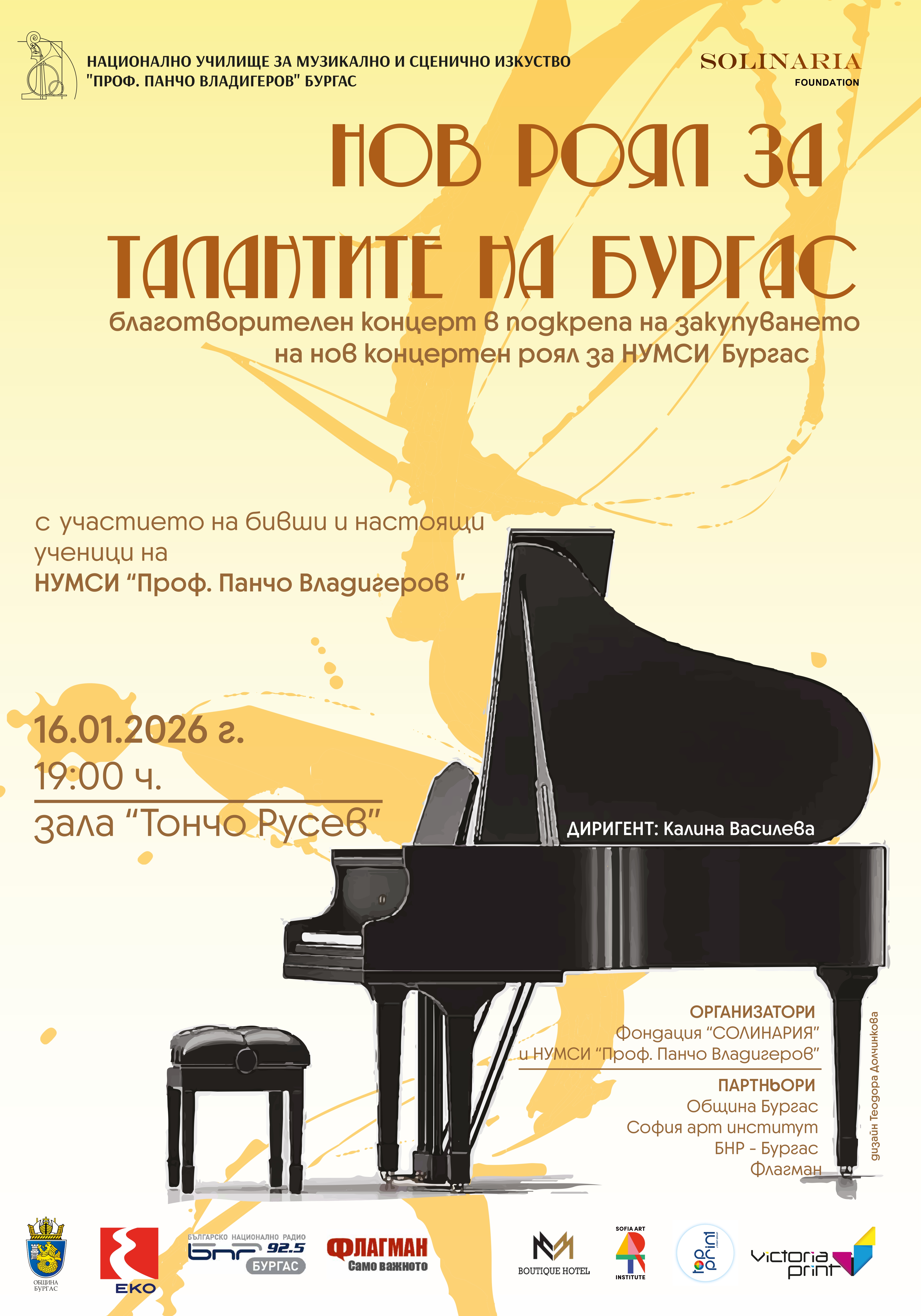 Фондация „Солинария“ и НУМСИ „Проф. Панчо Владигеров“ - Бургас имат удовоствието да ви поканят на благотворителен концерт „Нов роял за талантите на Бургас“, който ще се състои на 16 януари 2026 г. от 19:00 часа в зала „Тончо Русев“ на НХК. За повече информация: